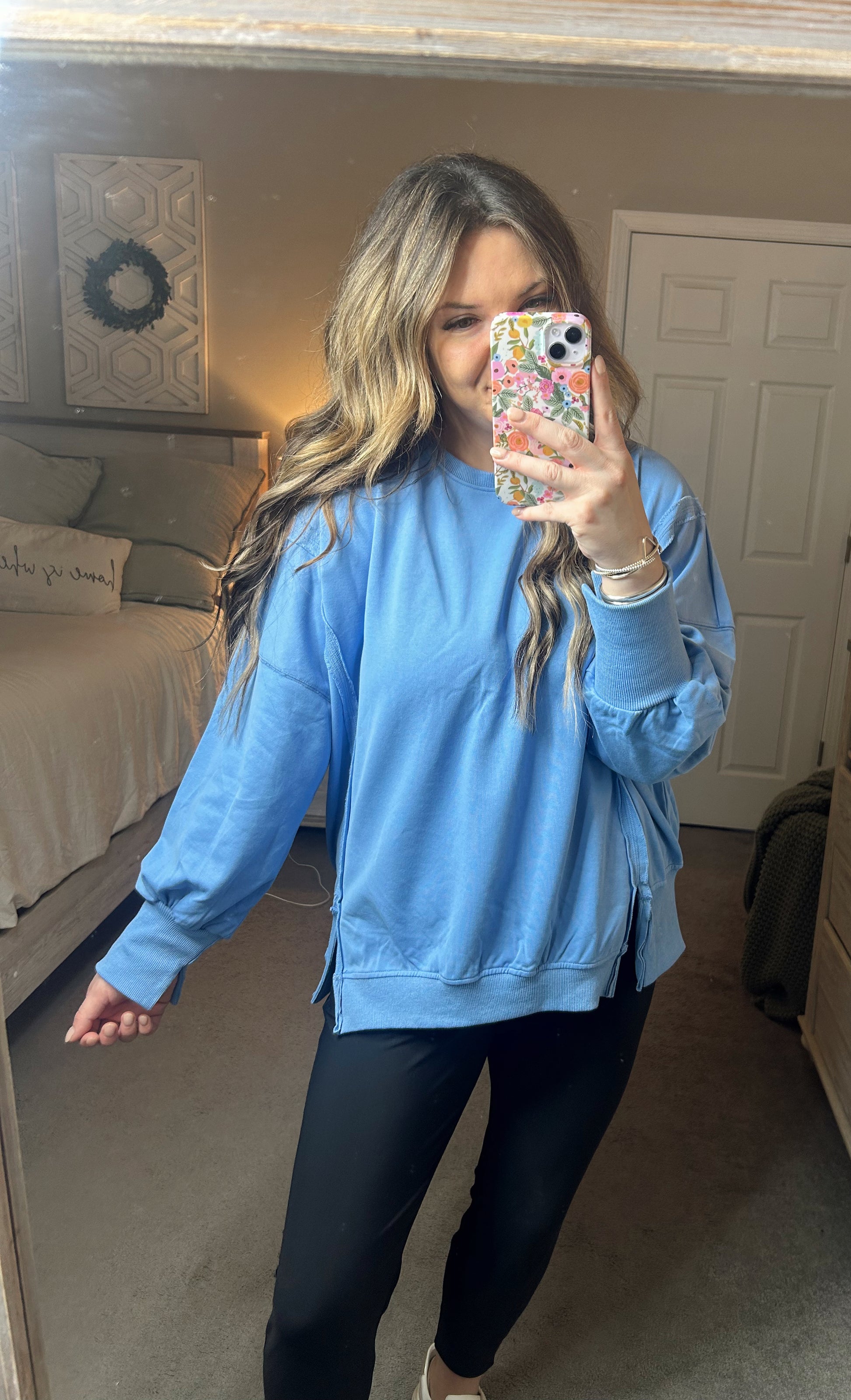 Gorgeous blue sweatshirt with side slits that add a flattering touch! Side slit on the sleeves as well. I’m wearing my true size large! Slightly loose fit.