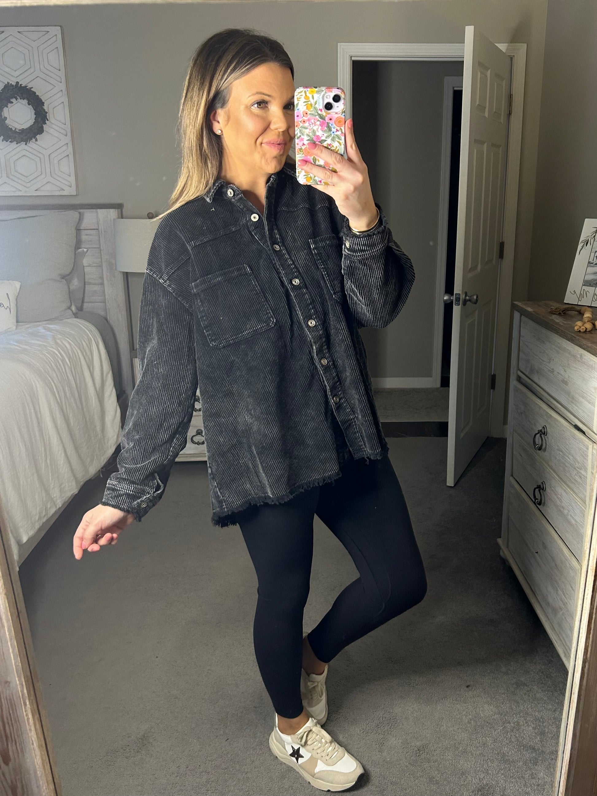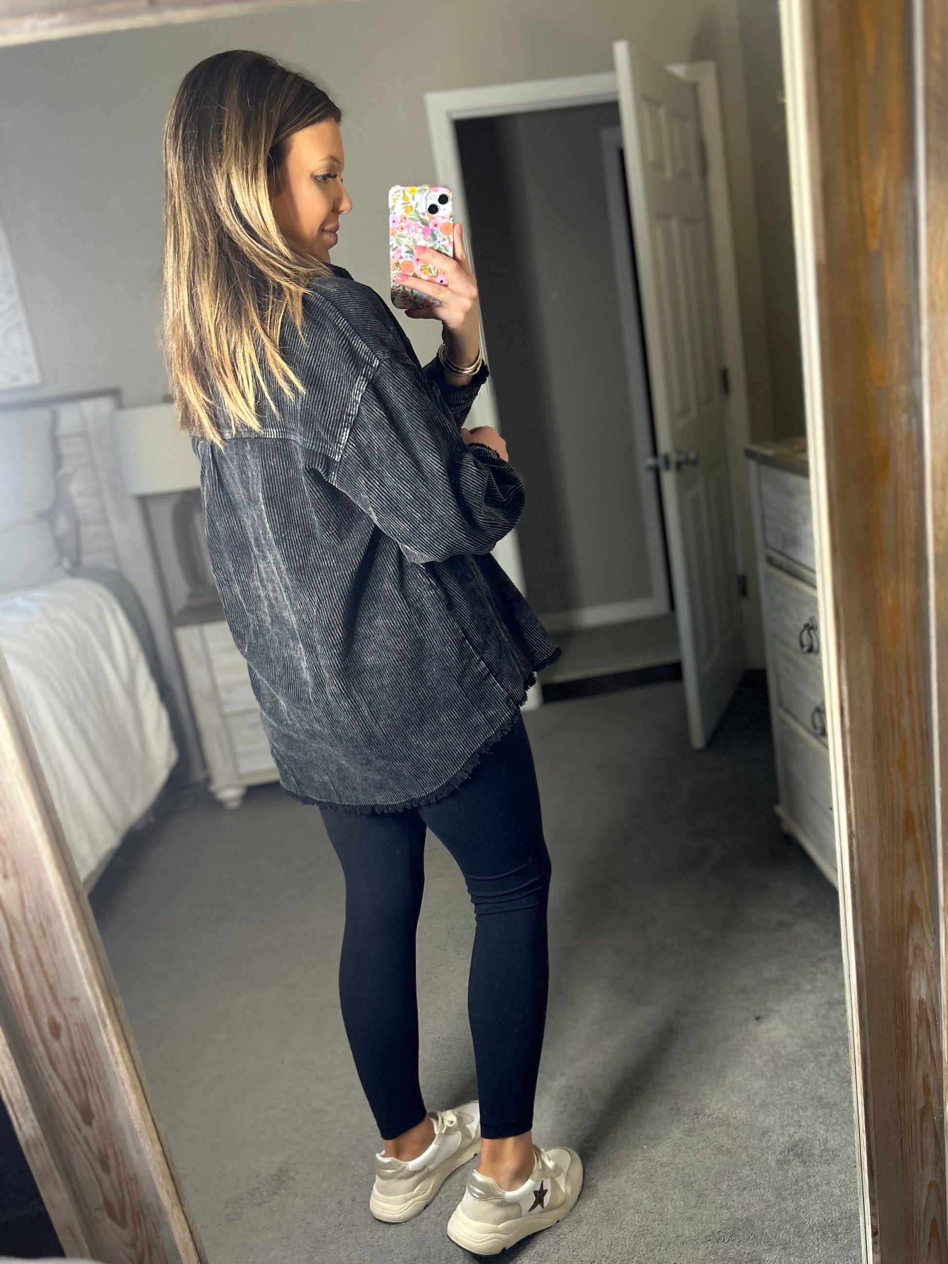 The top is even cuter on! A gorgeous black mineral wash with some distressing on the bottom. So easy to dress up or down!