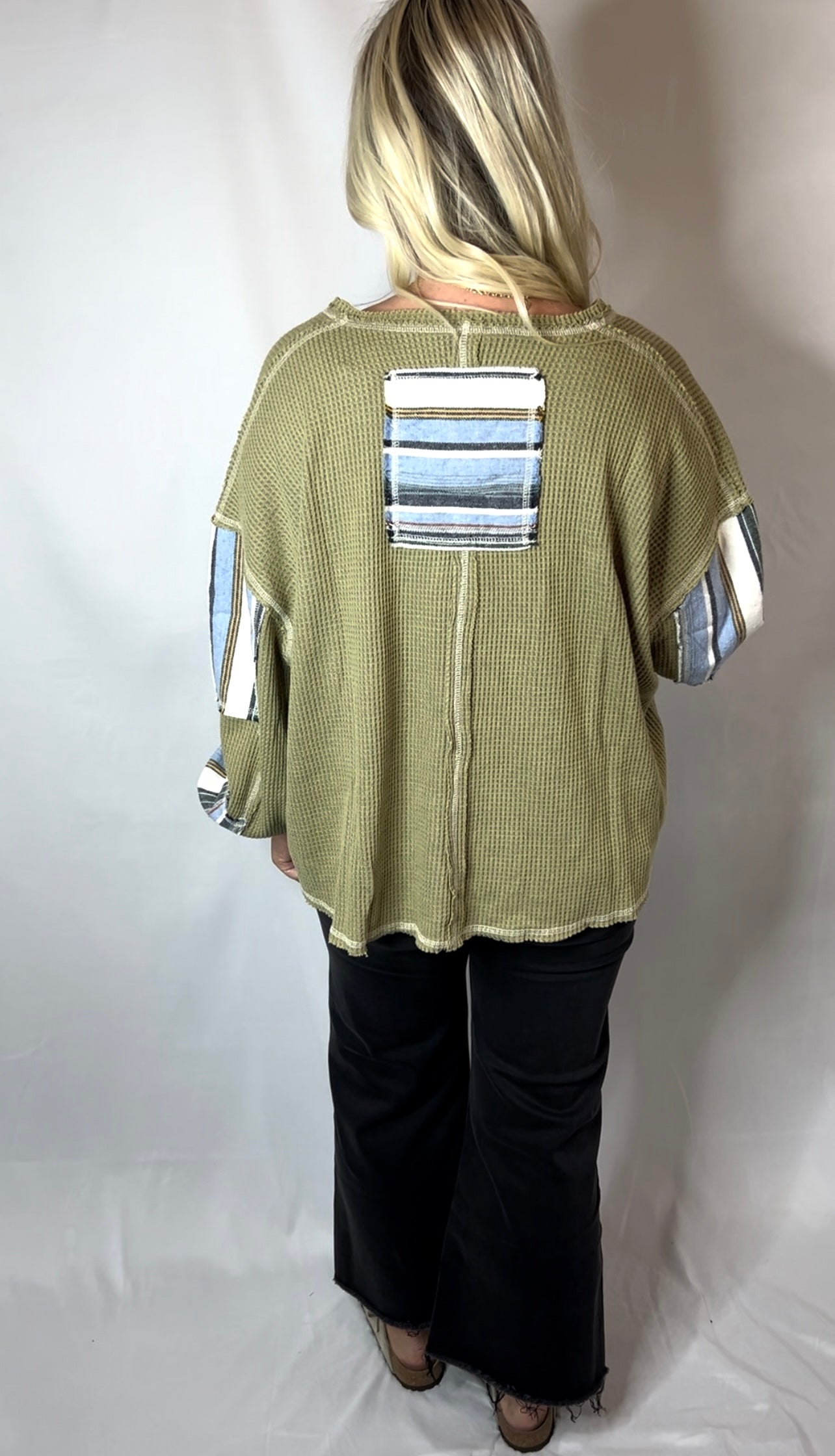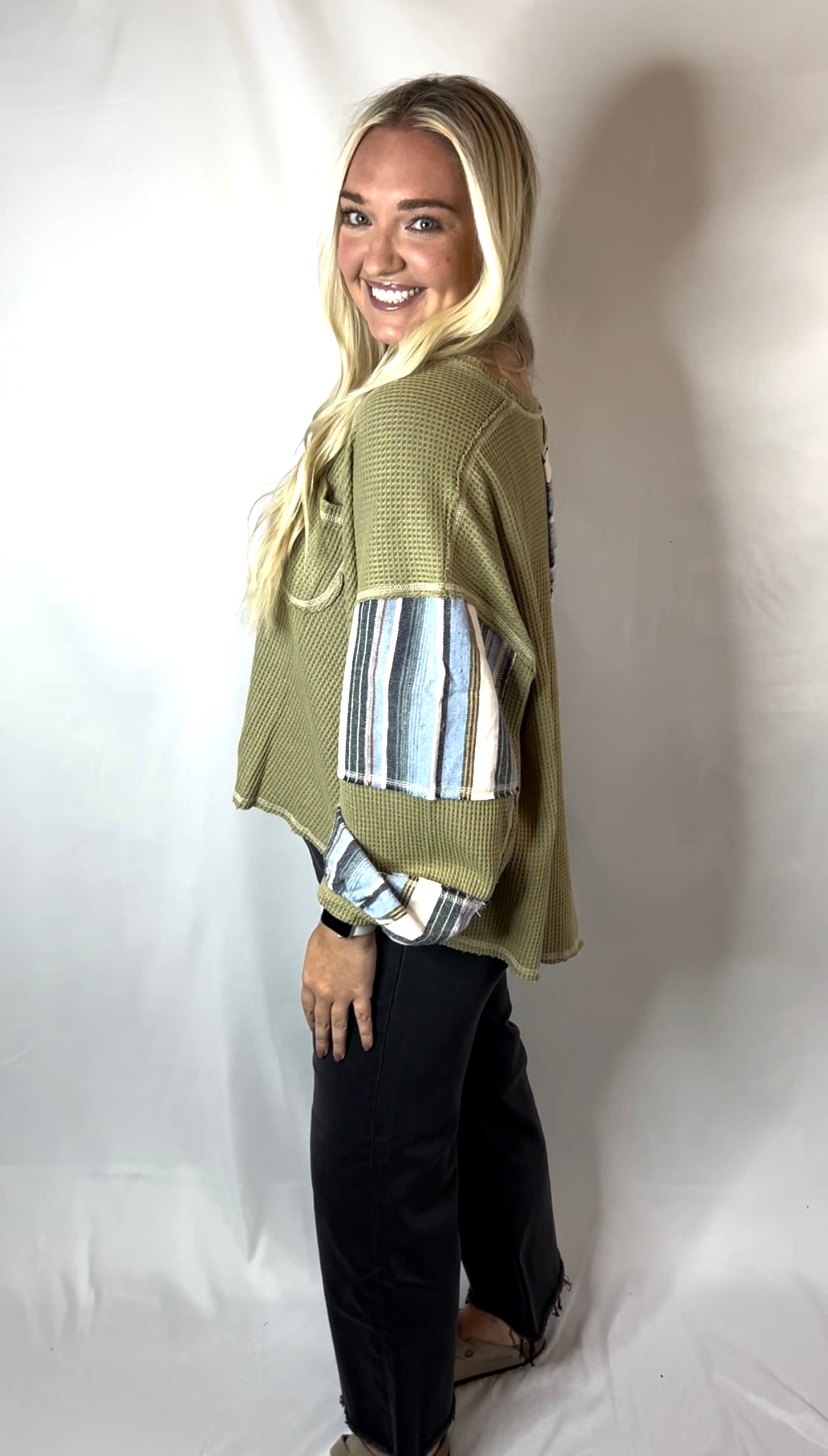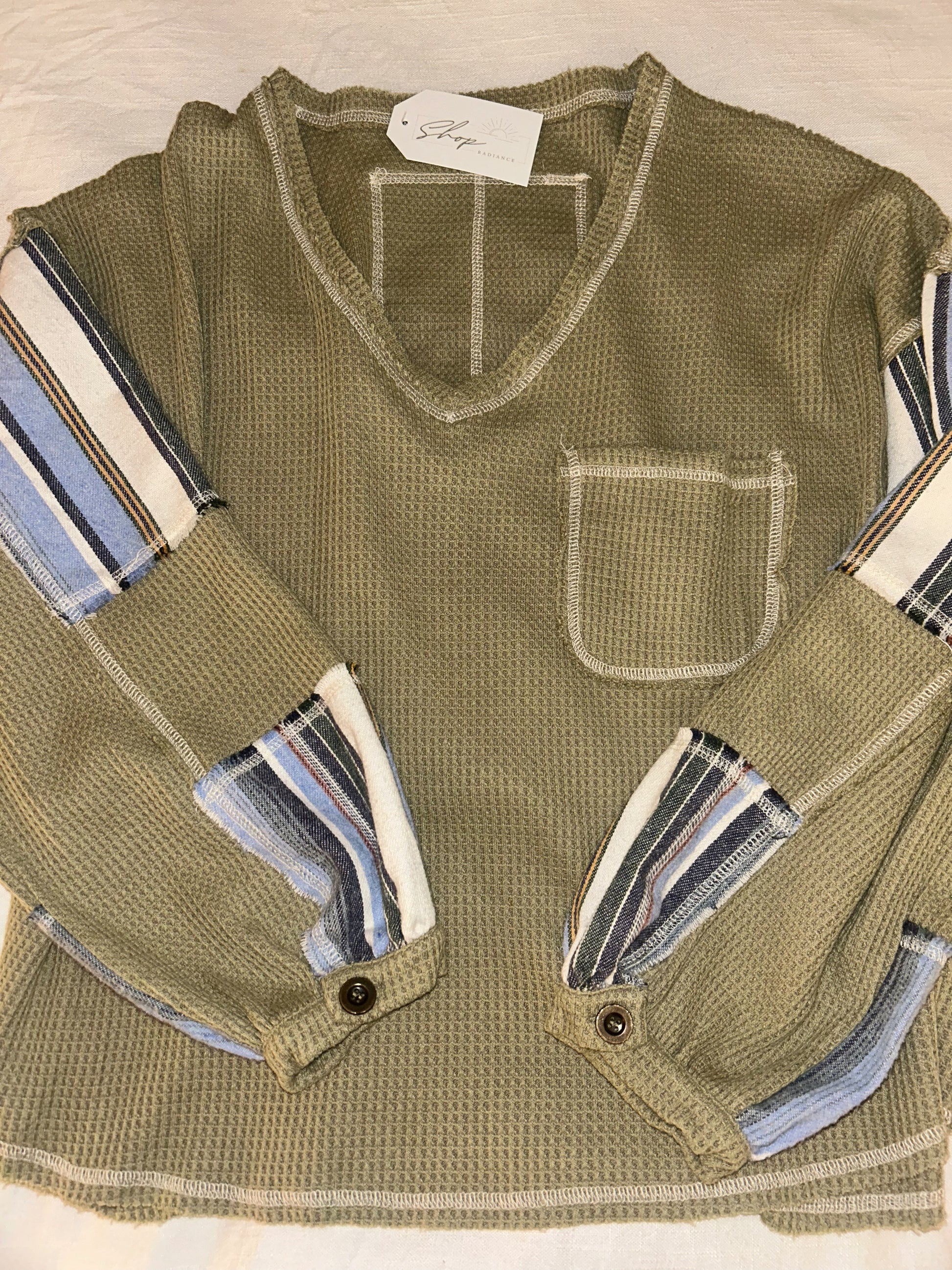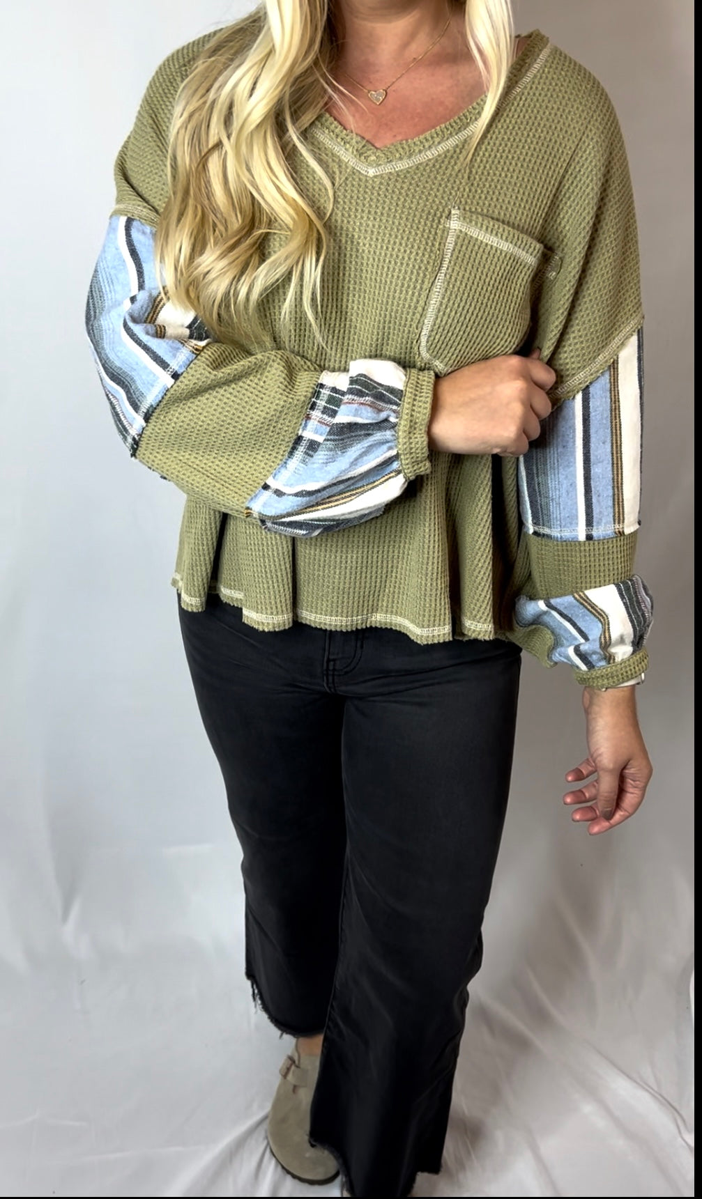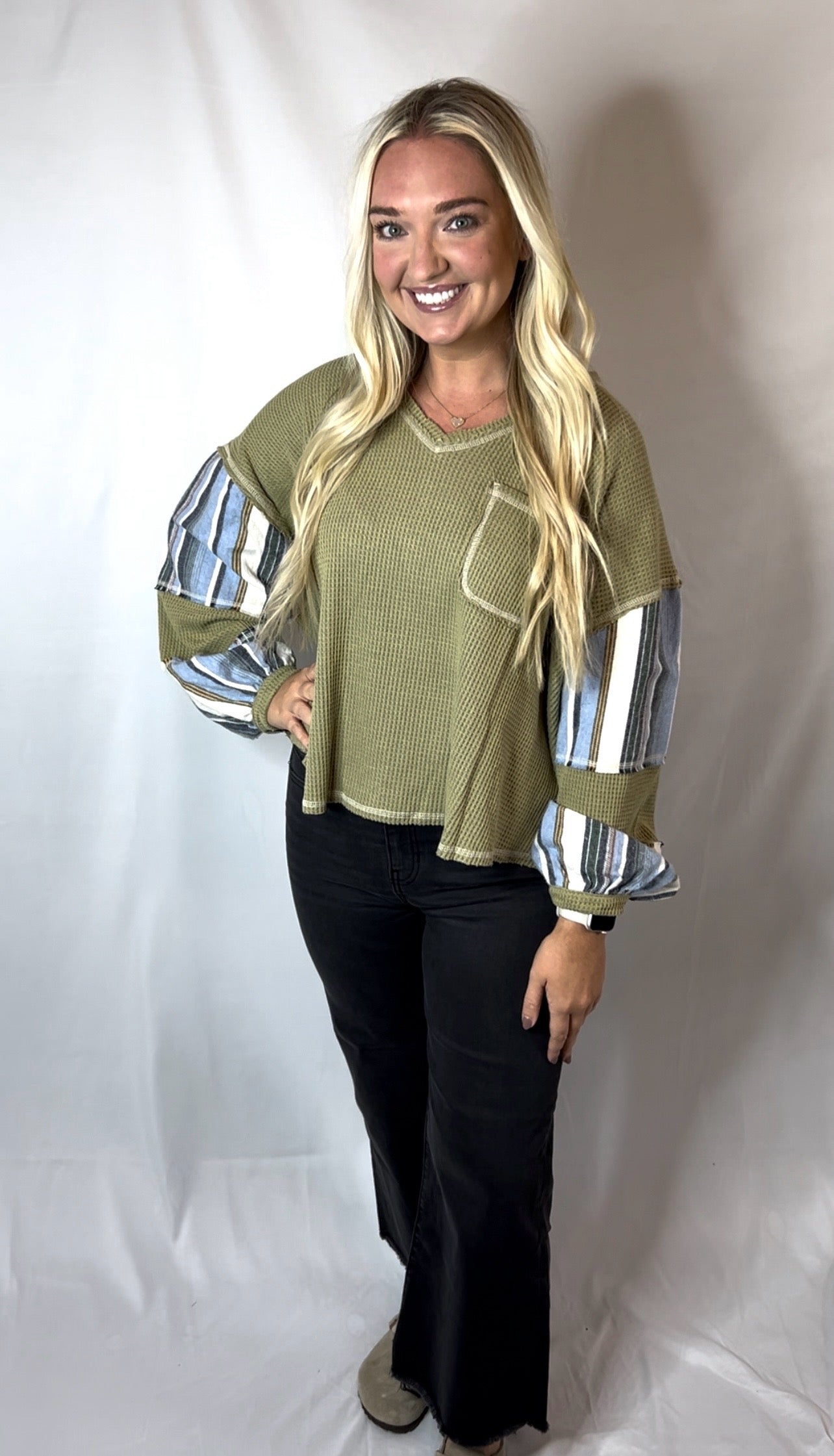 This top features a v-neck and striped balloon sleeves providing the perfect relaxed fit. Easy to throw on with leggings or jeans to keep you comfortable and stylish! True to size. Dakota is in a Medium